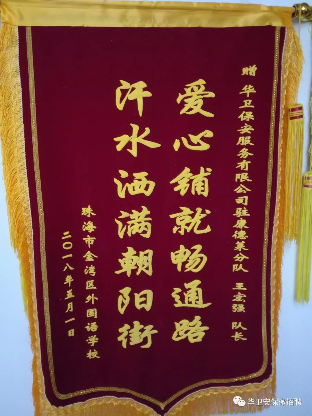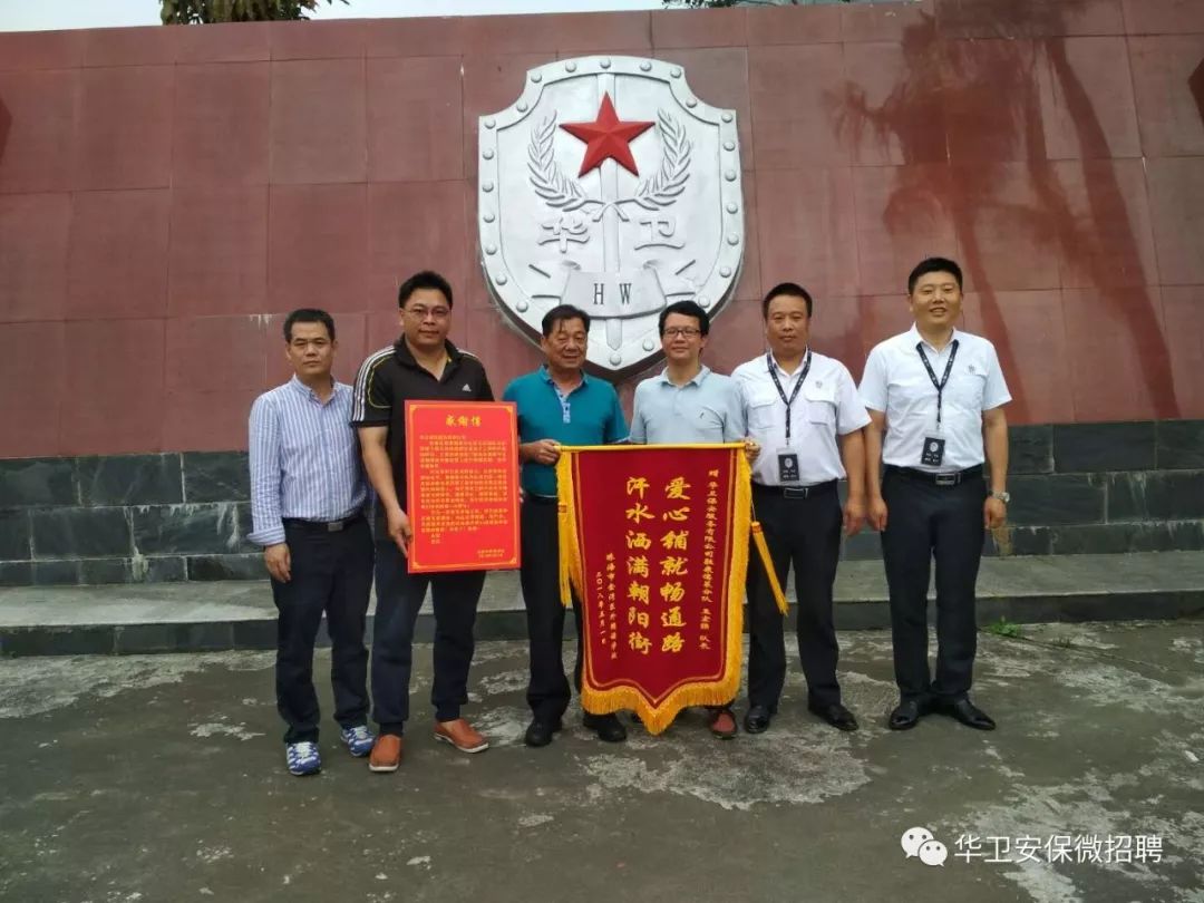 2018年4月28日上午10时,金湾外国语学校曾校长将“爱心铺就畅通路,汗水洒满朝阳街”锦旗送到珠海华卫保安服务有限公司,以表示对我司的感谢。